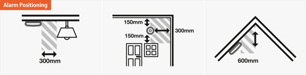 If you opt for a wall installation, ensure that the alarm is 300mm away from the closest wall and placed between 150mm and 300mm below the ceiling.